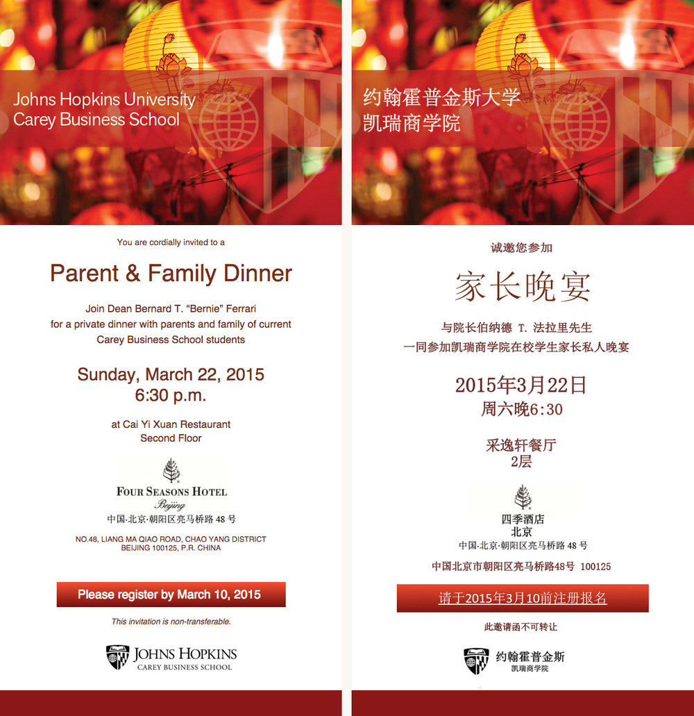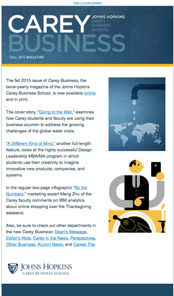 As the graphic designer on the Marketing & Communications team at the Johns Hopkins University Carey Business School, I was responsible for creating impactful and creative design solutions that met Johns Hopkins University and Carey Business School graphic identity standards. I worked on a wide variety of design-related tasks and projects, including HTML emails, fliers, posters, event programs, brochures and more.
